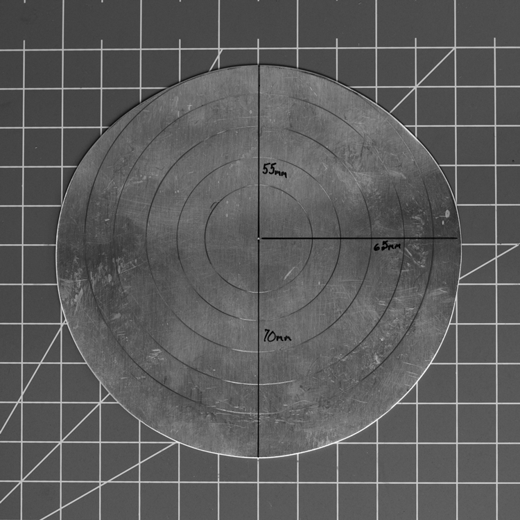 The third template was the final size, shape, & thickness I decided to work from. The four samples made from this starting blank all look different especially at the edge or opening of the hollow form. By changing the location of the kernel, mark at the bottom in which guide lines are drawn for hammering courses, and altering my hammering techniques mass or material can be moved to where it is needed, mainly the belly.